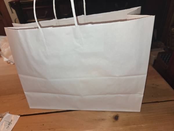 Box of gift bags, over 200, white heavy paper, 4 sizes, and translucent, plastic bags, a few rolls of ribbon as well. Brand new.