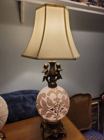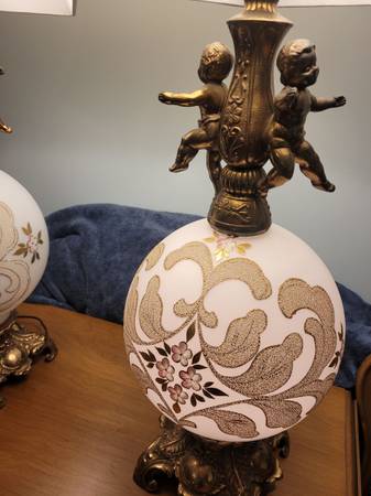 28 inches to top of light bulb ; 35 inches to top of shade. 7 inch Brass base. Lamp light and light inside globe on both lamps. Both lamps as pair $225 with shades. Will sell individually $125 for...