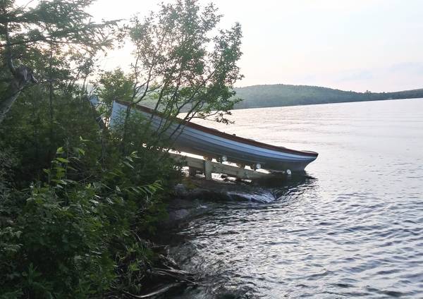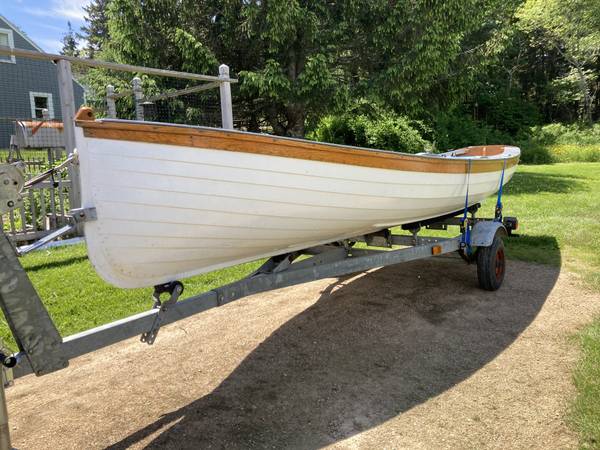 17' Whitehall sailing rowboat, with trailer. Built around 1993 near Lake Champlain, VT. Sturdy boat in excellent condition ... well-maintained. Freshly repainted last year. Comes complete with two sets of oars and sprit-rigged for sailing with mast, boom, mainsail and jib ... drop-down centerboard. New bronze stem band recently added. Galvanized trailer with new lighting. The boat has lovely lines and tracks well when rowing.