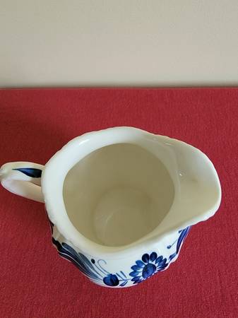 Beautiful things come in small packages. This is a hand painted (delftware like) creamer made in England by Ridgway, Est in 1792. The Ridgway family was one of the dynasties, manufacturing Staffordshire pottery. The English copied the Dutch using a similar design and processing method of tin glazing earthenware. Earthenware was relatively affordable and replaced the use of pewter. There are no cracks or chips. This is a gift quality piece. The creamer will hold 6 ounces.