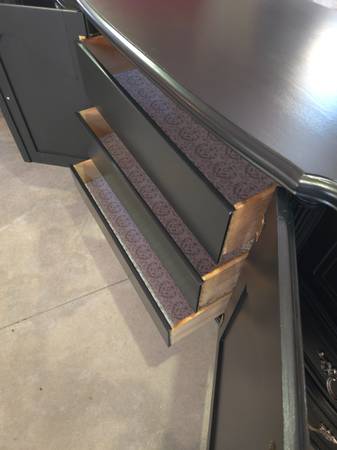 Solid wood set refinished in Tricorn black. All dresser re lined and work as they should. Original hardware cleaned keeping the original vibe to the set. Dresser 32.5t x 75l x 20 deep N Stands 25.5t...