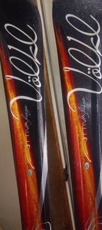 Nice pair of womens volkl attiva fuego skis, 161 length, 73 under foot with a 12.9 turn radius so these will make turns nicely, come with nice marker attiva bindings with max din setting of 11, tops of skis are near perfect, bottoms are smooth but I would suggest a light tuning to sharpen edges. very good light ski, these are well over $100 on ebay, asking only $40