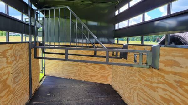 Pressure treated floors, Plywood lined walls, LED dome light, Chest & rump bars, Stall divider, Removable interior so trailer can be used as a stock trailer, 3″ tube main frame rails, 3,500lb axles, High-quality solid steel build, 24″ ATP stone guard , Powder coat paint, Chrome finish hub simulators, LED Lights, Radial Tires, Escape/side door, EZ Lube axle hubs, Safety chains, 2 5/16th” coupler, Sandfoot on Jack