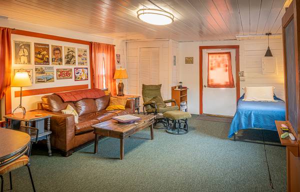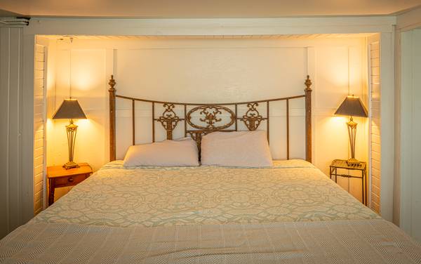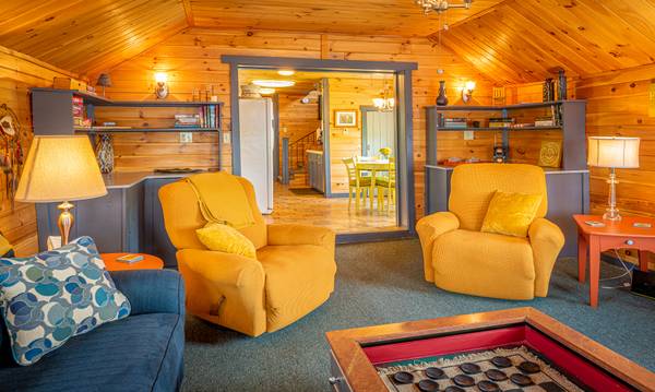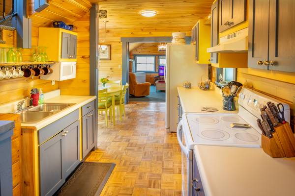 The Beach Bungalow Cabin is perfect for a couple on a Romantic weekend or for the sole traveler that has a sense of adventure or anyone who wants a quiet get-away to relax and explore the beautiful surrounding area. This cabin has an open concept design that takes advantage of the spectacular water view. There is a shower stall, toilet, small sink, full size bed located in the addition. A bureau, small area for hanging clothes, one recliner/rocker, one swivel/rocker/recliner, one twin bed, dining table with three chairs and a fully equipped kitchen located in the main part of the cabin.