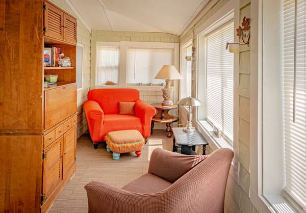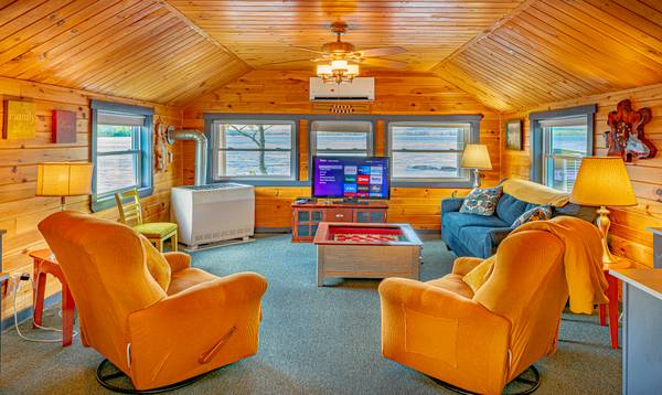 Our Newest and Largest Cabin is called “Lakeside Lodge” and is nestled in the nook of Dual Cove Point’s property. In the attached addition we feature generous open concept for daily living. It houses a well equipped Kitchen with full size appliances and most utensils and dishes, Dining area seats 4 and can be bumped up to 6, and Living Area has a glider with hassock, love seat, Sofa and 32” Roku TV. Next the first floor of the attached two story cape houses the Master Bedroom which consists of a King Bed, small closet, bureau and chair with a 5” wide window facing the beach you can enjoy while you lounge in Bed. Next to the Master is a cozy sleeping porch with two night stands, one Day Bed and a Club Chair. The 3/4 Bath is on the other side of the Master with a 4” wide shower, single sink, hair dryer, toilet and shelves for your personal items. The foyer has plenty of coat hooks and a shoe rack. And lastly there is an enclosed front porch with a large comfy chair with ottoman, a club chair and bookcase that holds books, Games and puzzles, just so you to get away from the TV. There is a charcoal BBQ and had griddle off the the back steps and a fire pit.